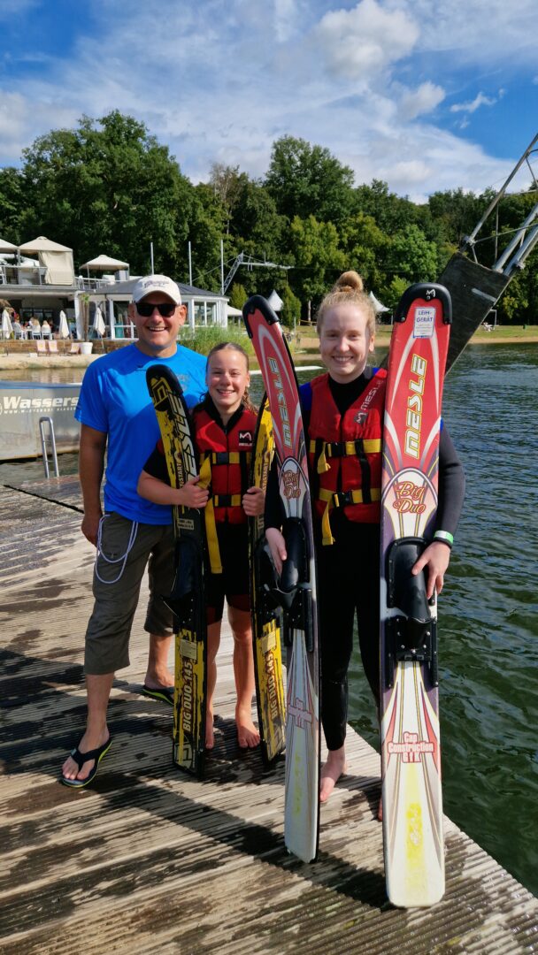 Viel Spaß und fröhliche Gesichter begleiteten wieder das Wasserski-Event der Schwimmabteilung am Blauen See. Traditionell mieten wir den Übungslift für die jüngeren Kinder. Ob Kneeboarding, Wasserski oder Aquapark: gute Laune und Spaß waren garantiert. Die älteren Teilnehmenden starteten direkt auf der großen Anlage in die Seerunde. Und wie gewohnt field auch hier der eine oder andere am entferntesten Ufer aus der Runde, so dass der Rückweg mit Board oder Ski tragend zu Fuß angetreten werden musste. Zum Abschluss gab es Bratwurst vom Grill.